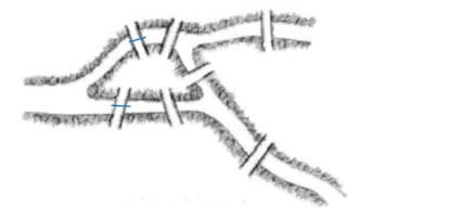Al pasar de Königsberg a Kaliningrado y de 7 puentes a 5, hay 21 parejas de puentes distintas que podrían haber desaparecido (7×6/2). Y 15 de estas parejas, al desaparecer, dejan dos zonas con un número par de puentes y las otras dos con un número impar. Por ejemplo, si eliminamos los puentes marcados en la figura (que a primera vista parecen los más prescindibles), ambas islas quedan con 3 puentes y ambas orillas con 2. Por lo tanto, necesitamos algún dato adicional para saber cuál de las 15 parejas de puentes posibles ha sido eliminada. Lo que podemos afirmar es que, sean cuales fueren los puentes desaparecidos, ahora el problema -resoluble- de los puentes de Kaliningrado es equivalente al archiconocido de dibujar un sobre abierto sin levantar el lápiz del papel ni pasar dos veces por el mismo trazo. ¿Ves la equivalencia? Y no digas que las zonas de Kaliningrado son 4 mientras que el sobre tiene 5 vértices (¿por qué no has de decirlo?).